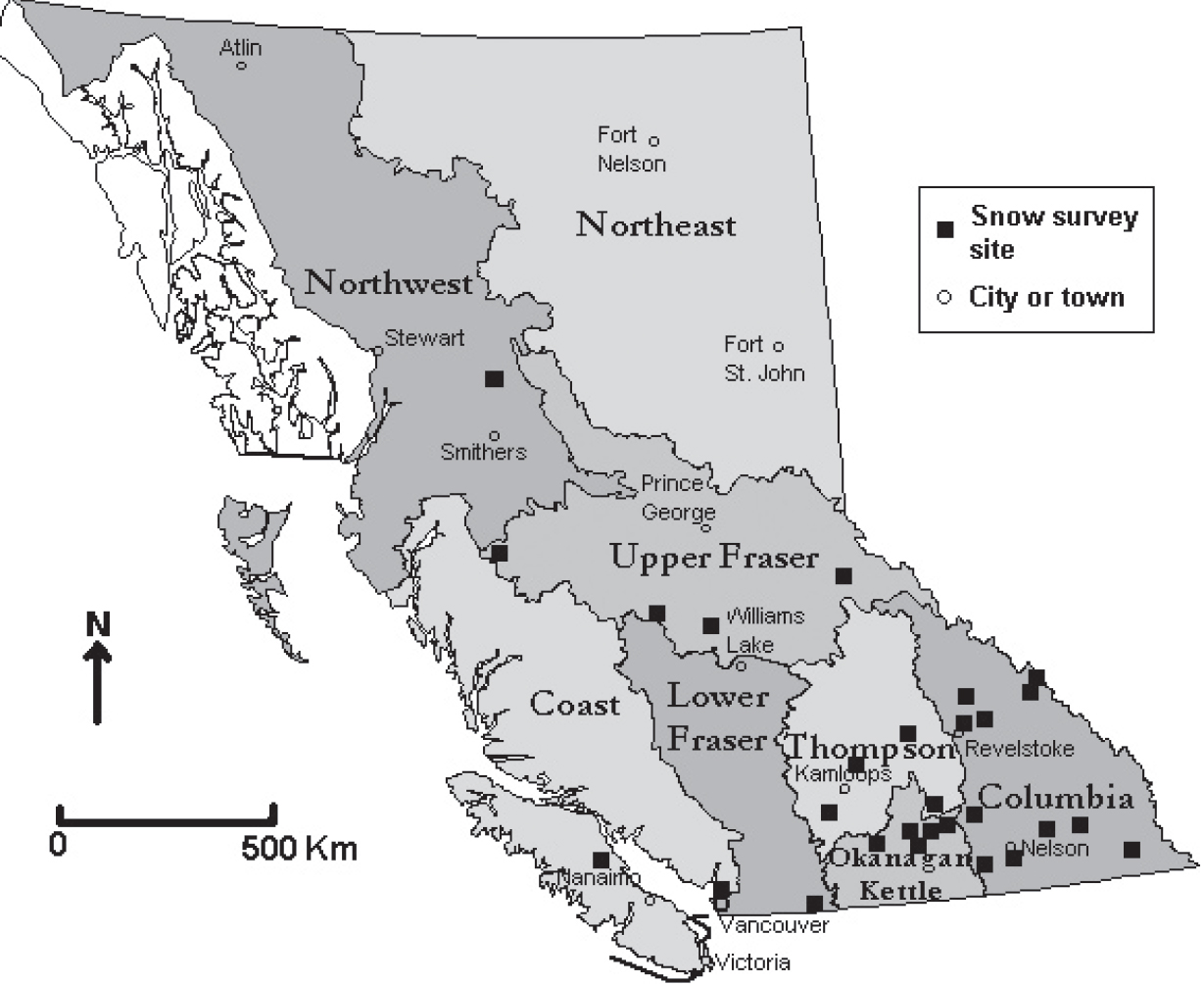 Figure 2 – Map of British Columbia showing the eight regions: Northwest, Northeast, Coast, Upper Fraser, Lower Fraser, Thompson, Okanagan-Kettle and Columbia. The snow survey sites used in this study and landmark cities or towns are also marked (Source: British Columbia Ministry of Water, Land and Air Protection) The BC Ministry of Water, Land and Air Protection (MWLAP) divided the province into eight regions based largely on major drainages. Figure 2 shows the eight regions and the snow survey sites used in this study. The first thing you’ll notice is a lack of sites in the northern half of BC In fact, no sites were used in the Northeast region due to insufficient data so you can disregard the Northeast. The southern regions, on the other hand, have sites with historical data dating back to the mid-1930s. For the sake of statistical significance an emphasis has been placed on the southern half of the province.
