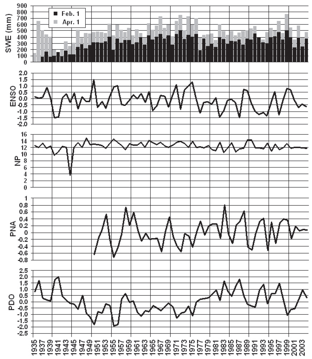 SWE = aPDO + bPNA + cNP + d (1) When the three indices are combined, the R2 for February 1st SWE was greater than for any individual index, suggesting that more variability can be explained by combining of PDO, PNA and NP. This, however, is not the case for April 1st SWE, where PNA outperforms the combined indices.