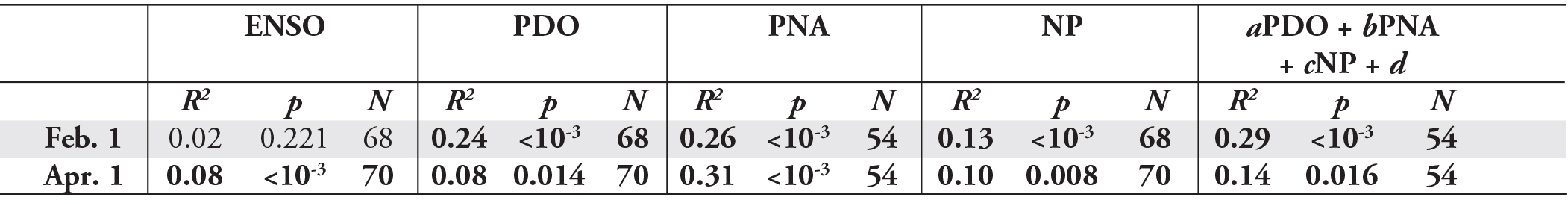 Multivariate least-squares linear regression was used to assess the predictive merit of the top three performing indices combined. In this case, PDO, PNA and NP were used according to the following equation: