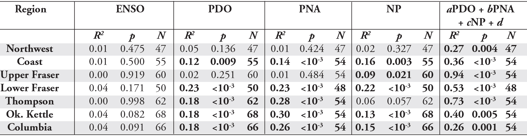 Regional Once again PDO, PNA and NP in Table 3 seemed to outperform ENSO with more statistically significant correlations and higher overall correlation coefficients. In fact, none of the regions had significant correlations between ENSO and February 1st SWE. All correlations with ENSO and NP are again positive, while all correlations with PDO and PNA are negative. All regions, except the Northwest, had significant correlations between at least one index and February 1st SWE. Once again, PNA seemed to be the best performing index for February 1st SWE, especially for the Thompson, Okanagan-Kettle and Columbia regions. Multivariate least-squares linear regression was again used to assess the combined predictive merit of the PDO, PNA and NP indices based on Equation 1. By combining the three indices, the ability to predict February 1st SWE for all regions, except the Columbia region, was improved. In fact, for the Upper Fraser region the three indices were able to account for 94% of the variability in February 1st SWE.