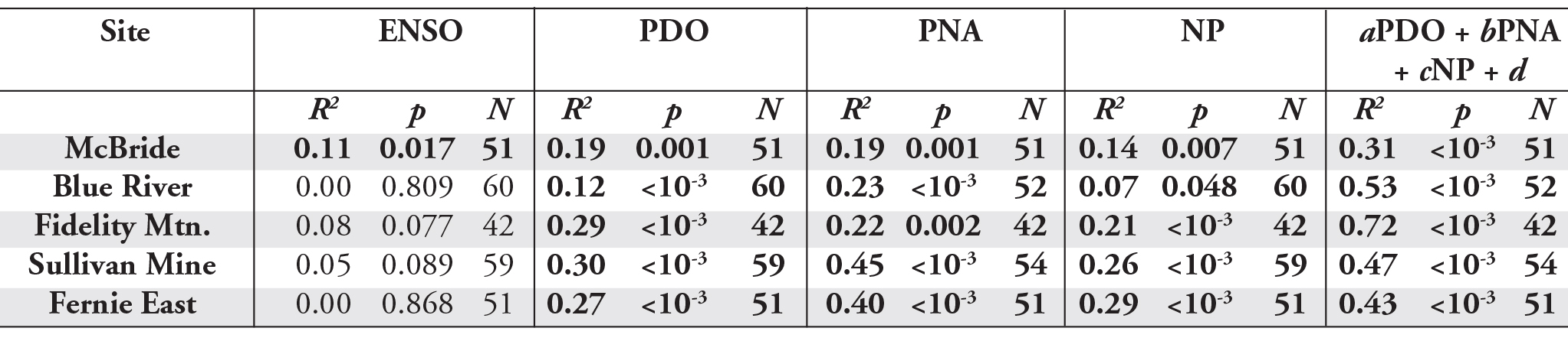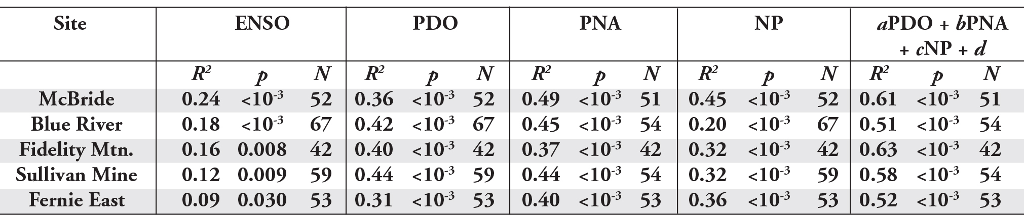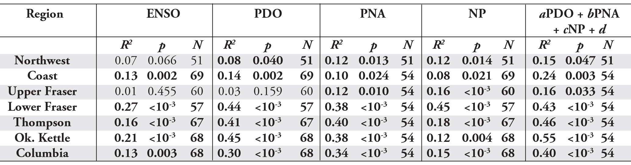Table 4 – Squared Pearson linear correlation coefficients (R2) for the correlations between April 1st regionally averaged SWE and each of the four climatic indices. The coefficient of multiple determination (R2) for the equation: SWE = aPDO + bPNA + cNP + d is also given. All coefficients which have a p < 0.05 are marked in bold.