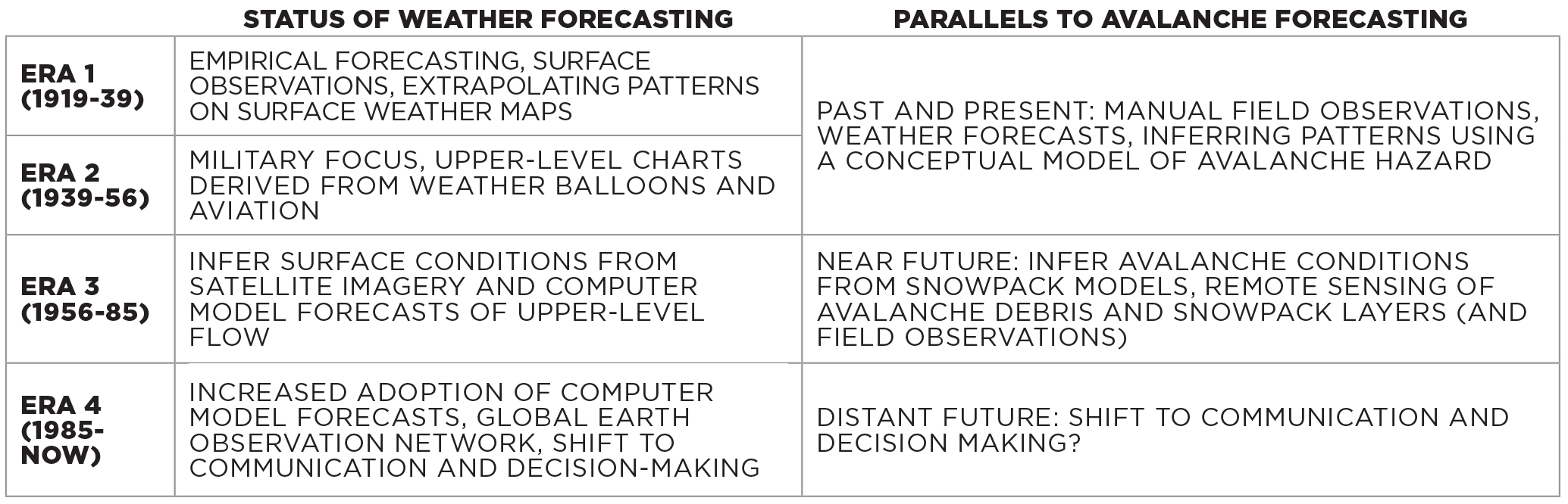 The InfoEx is a current example of a forecasting tool that helps us build an understanding of avalanche conditions based on field observations and analysis by fellow professionals. Perhaps a future version of the InfoEx could combine the information we currently use with satellite maps of avalanche debris and some fusion of a remotely-sensed and computer-simulated snowpack visualizations to give us a more complete picture of avalanche conditions. If designed effectively, such a tool should help us assess hazards faster, more efficiently, and more accurately.