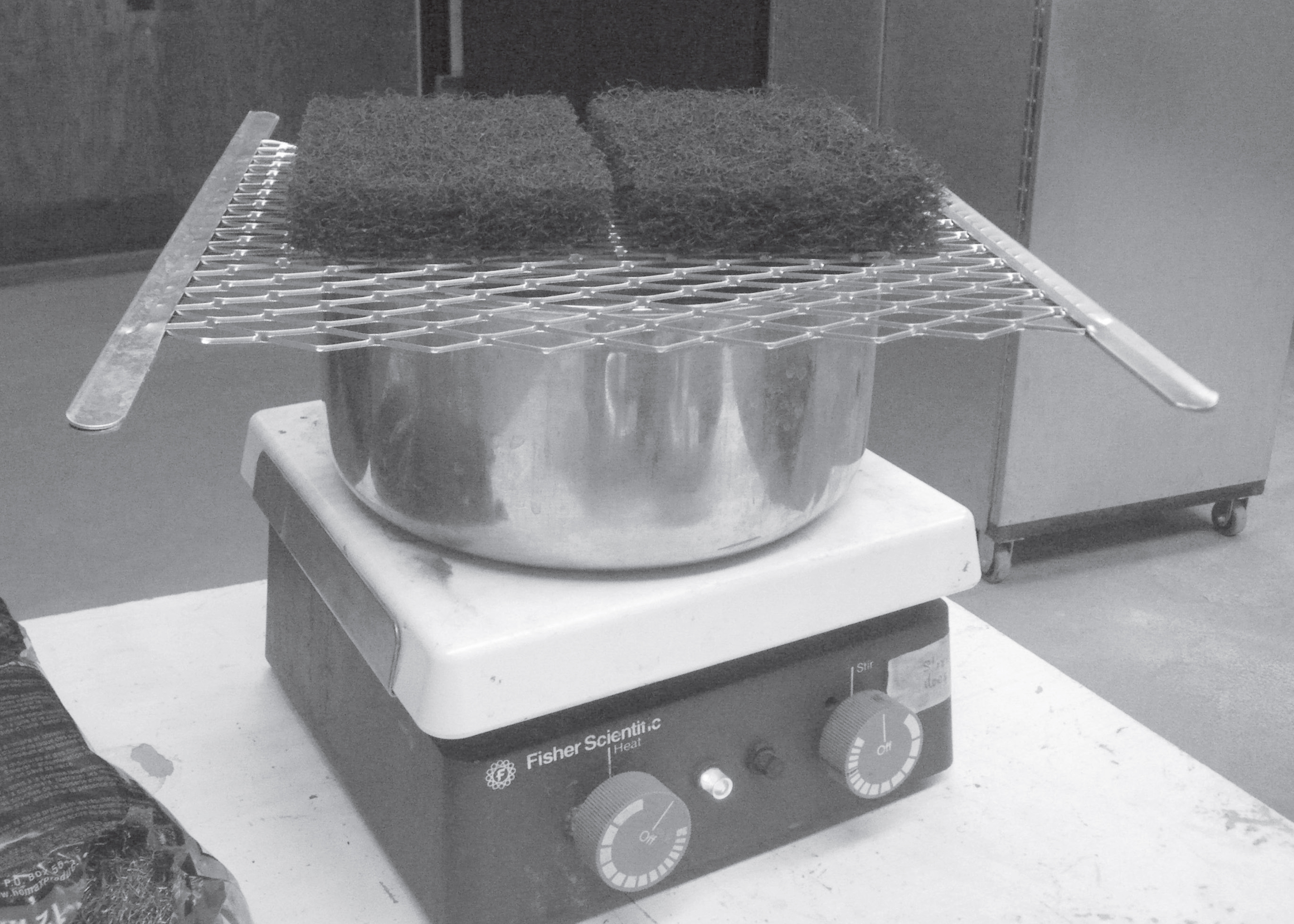 Figure 1: Using basic equipment, the researchers worked to replicate a small sample of what nature does in incredible variety—make surface hoar. The Experiment On July 14, jumping head first into the experiment, we decided to do the intuitive thing; boil water, move it into the cold lab, trap it with a plastic container and simply let the natural phenomenon of self assembly take the reins. You can see the simple apparatus consisting of a pot of boiling water, a steel paint strainer, and two plastic paint strippers in Figure 1, all to be covered by a plastic bin. The apparatus was not sophisticated; there was no delicate thermocouple wires dedicated to providing temperature readings or expensive gadgets measuring relative humidity, yet, it was successful. After leaving it overnight in a dark cold lab, devoid of sky view and significant air flow, tiny ice sculptures appeared on the underside of the steel paint strainer.