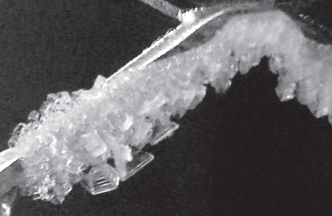 At different temperatures there would be, inevitably, different formations occurring. Plates formed at an ambient cold lab temperature of -7 ºC (Figure 2), while needles and feathery structures formed at -12 ºC and -13 ºC (Figure 3). A transition zone producing stretched plate structures was also observed from -9 ºC to -11 ºC. To give you an idea of size, the plates measure on the scale of a few millimetres while the needles grew to a maximum of one centimetre.